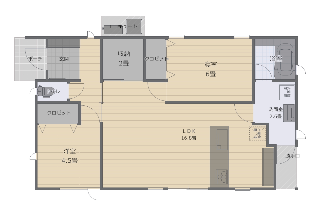 間取り | LDK16.9帖 ・ 寝室6帖 ・ 洋室4.5帖 ・収納2帖 |